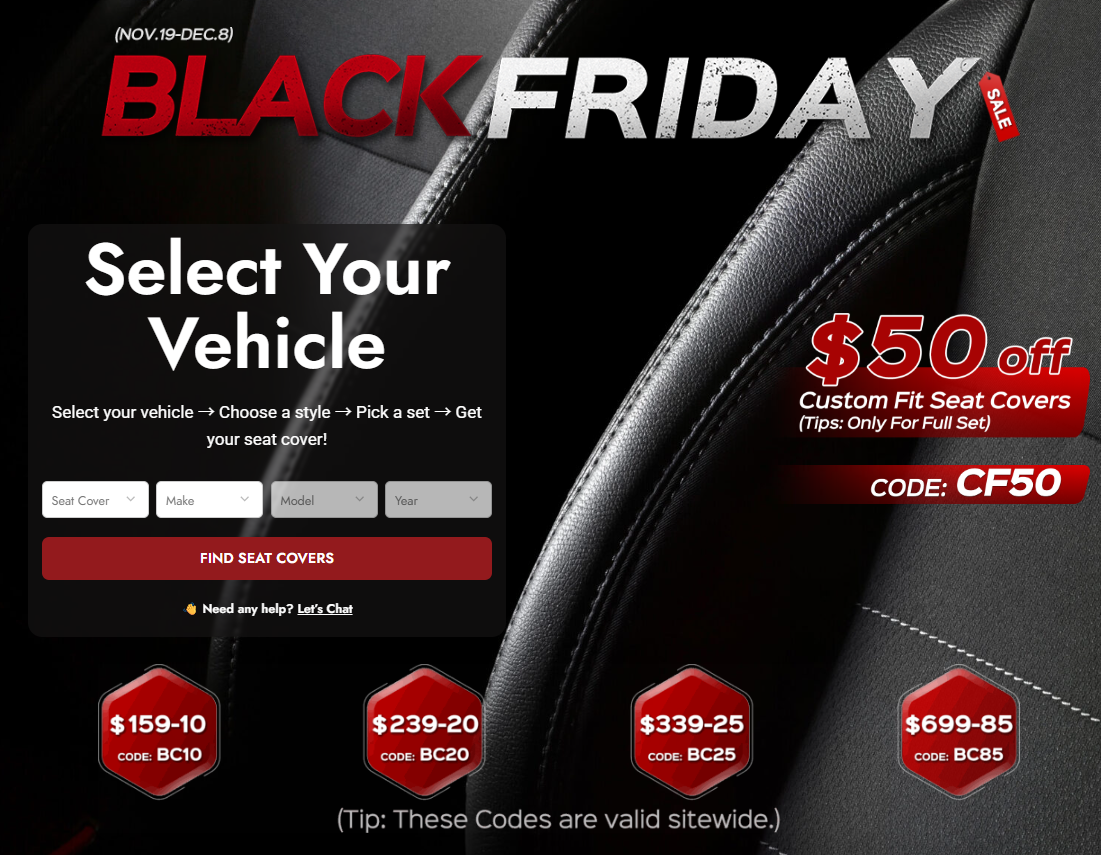 Black Friday only runs from November 19 to December 8 on the Covers4Car homepage, and the most popular styles and color combinations sell out first. If you have been thinking about custom fit seat covers all year, this is the moment when price, selection, and timing finally line up.