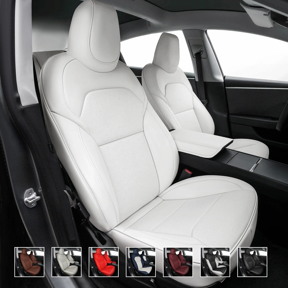 Genuine leather Tesla Model Y Covers trade a bit of softness for extra toughness. They handle long-term use, child seats, and heavy coats very well. With regular conditioning, genuine leather stays flexible and continues to guard the factory seats season after season.